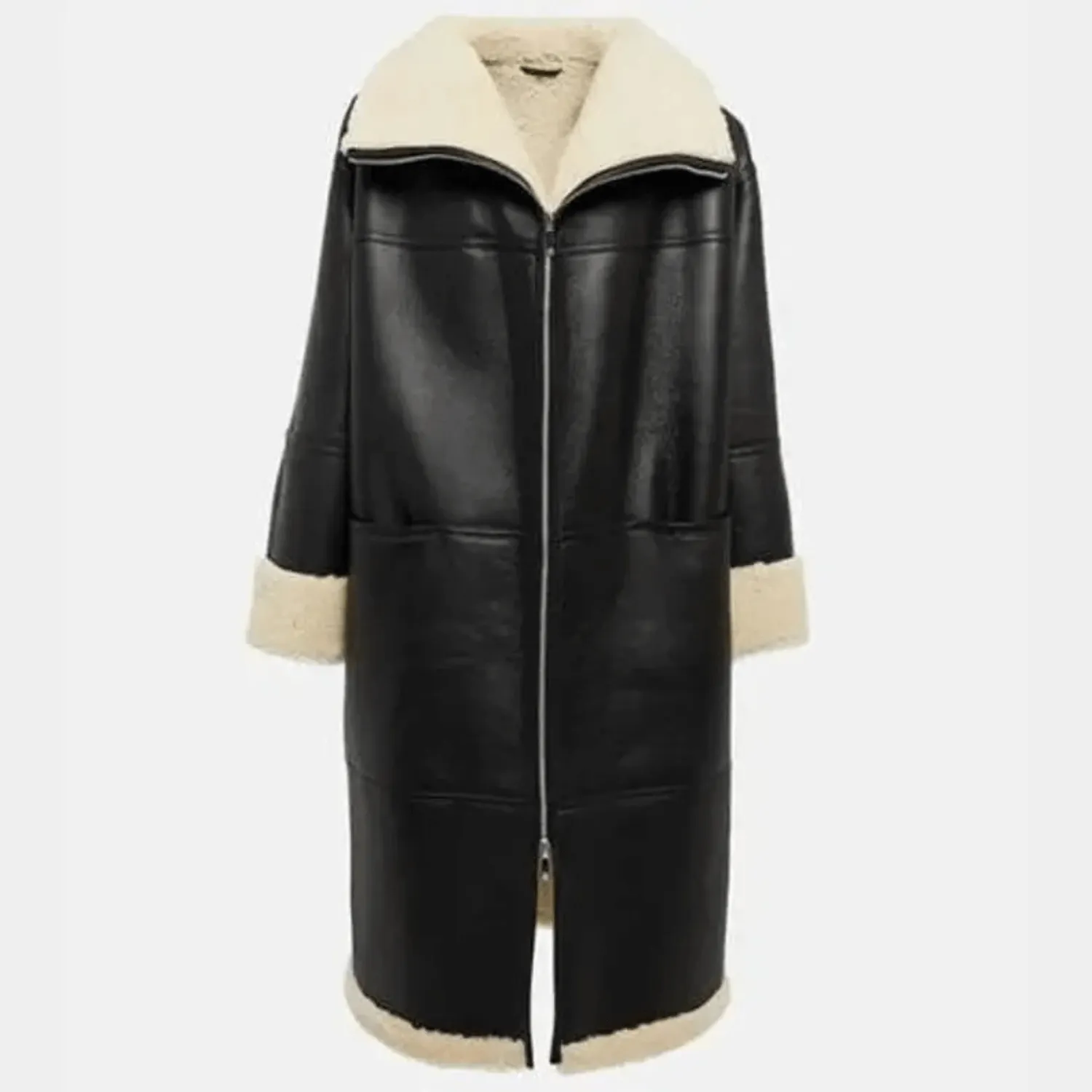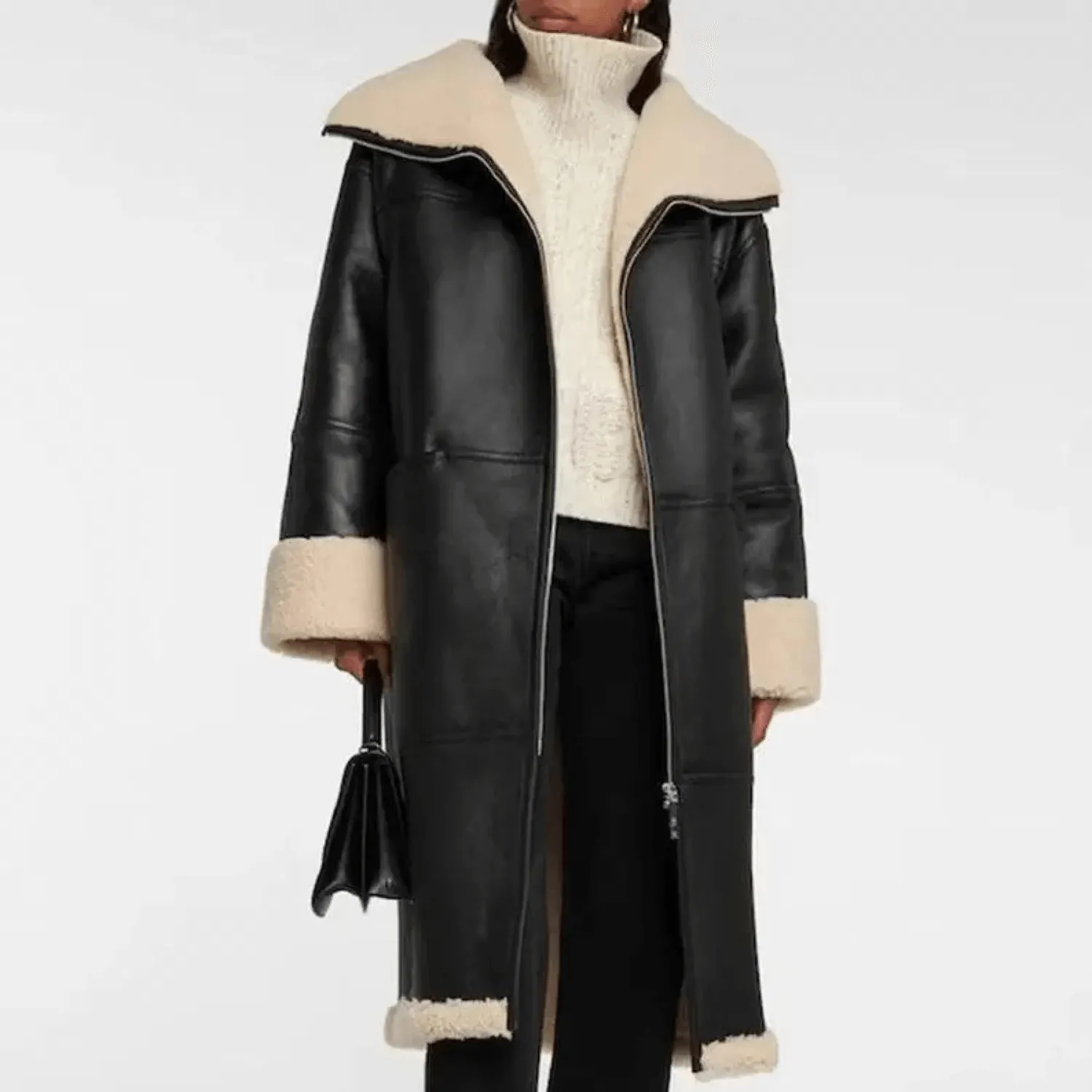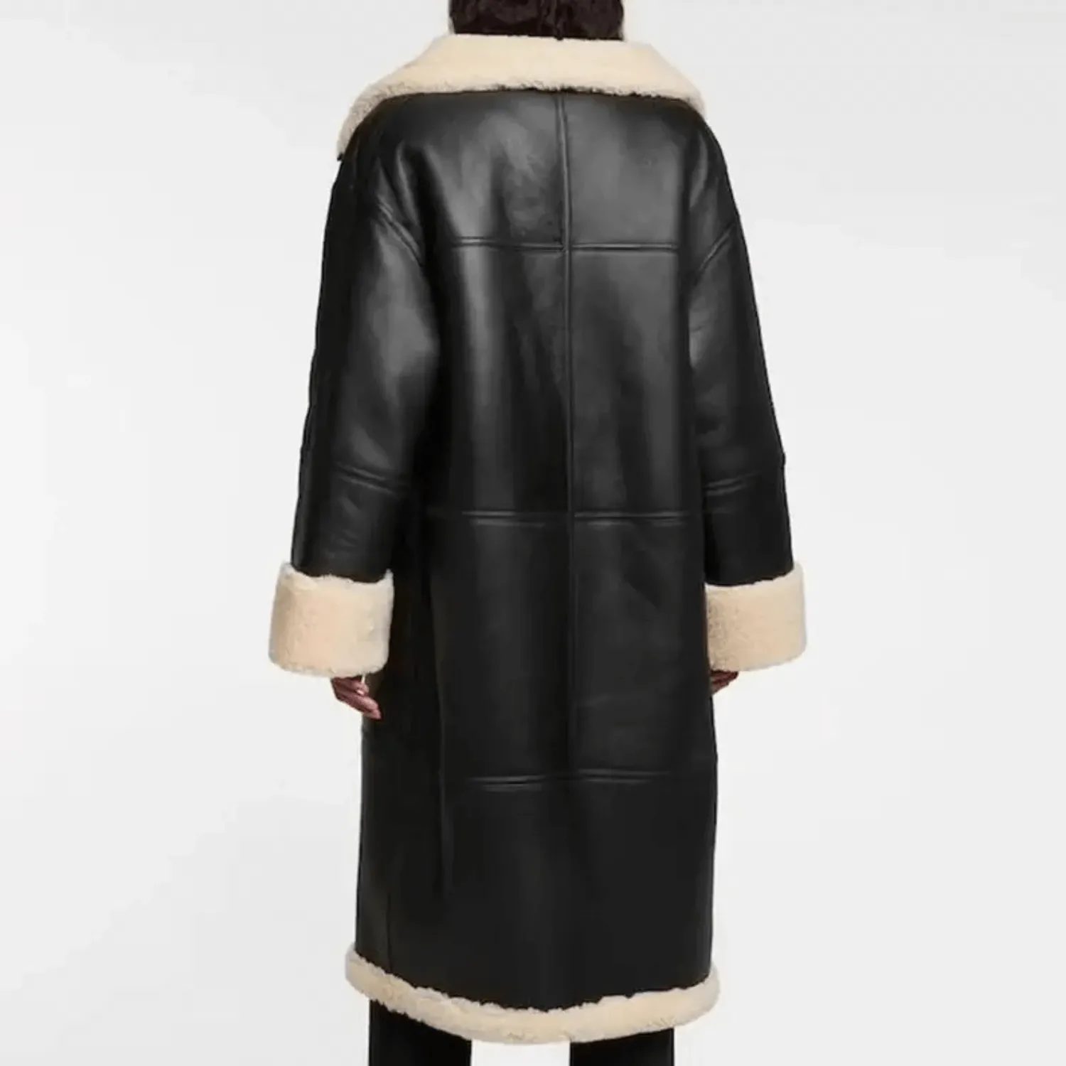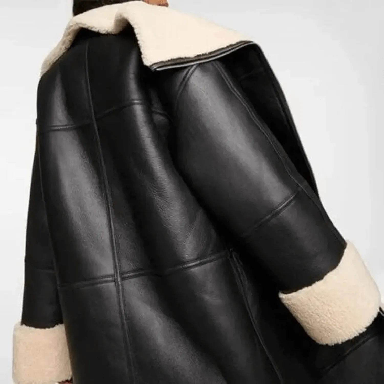 Introducing our Women’s Shearling Fur Leather Coat – the epitome of elegance and warmth. This luxurious coat combines a refined design with practical winter comfort, crafted from high-quality leather and lined with soft, genuine shearling fur for the ultimate in cozy sophistication. The sleek black exterior contrasts beautifully with cream shearling accents on the collar and cuffs, creating a chic look that’s both stylish and functional. Whether braving chilly winds or adding a polished touch to your ensemble, this coat is the perfect winter wardrobe addition.