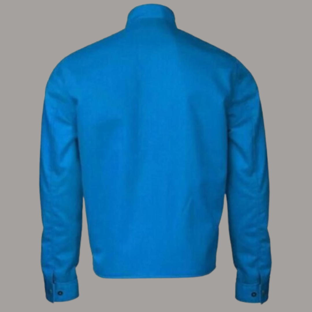 Featuring an erect snap tab collar and a YKK-branded zippered front closure, this jacket combines style and functionality. It includes two inner pockets and one outside pocket with a flap for securing your essentials. The full-length sleeves are finished with snap tab cuffs, adding to the overall sleek design. Available in a striking Blue color, this jacket is a must-have. Order now and experience the perfect blend of style and comfort.