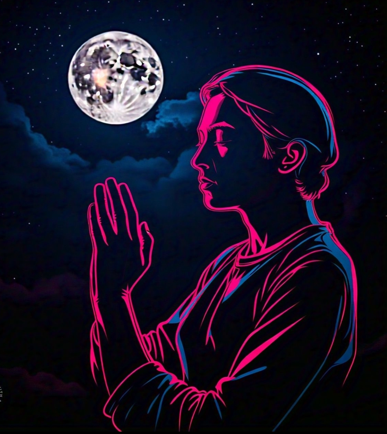 This captivating image of a person praying under the full moon evokes a sense of tranquility and introspection. The moonlight bathes the scene in a soft, ethereal glow, symbolizing hope and guidance. It captures the essence of spiritual connection, reminding us that in moments of stillness, we can find clarity and strength. This artwork beautifully illustrates the harmony between human emotion and the vastness of the universe, inviting us to reflect on our inner selves and the greater mysteries of life.