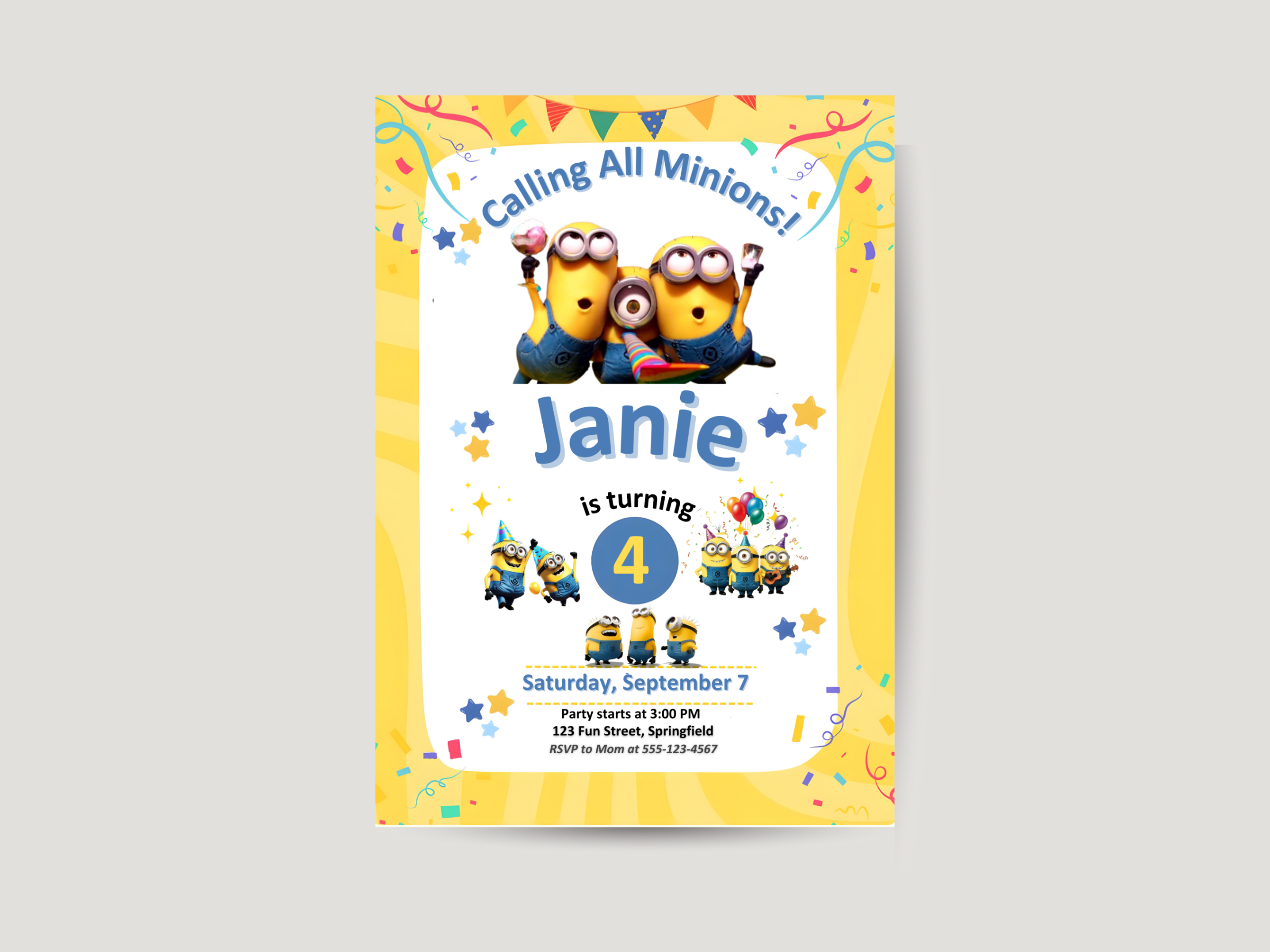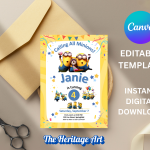 Make your little one’s birthday extra special with this Minions Birthday Invitation Template! Bright, cheerful, and fully editable in Canva, this digital invite is quick to customize and ready to share or print. Designed for stress-free party planning, it’s the perfect mix of fun visuals and clean layout—download instantly and let the celebration begin.