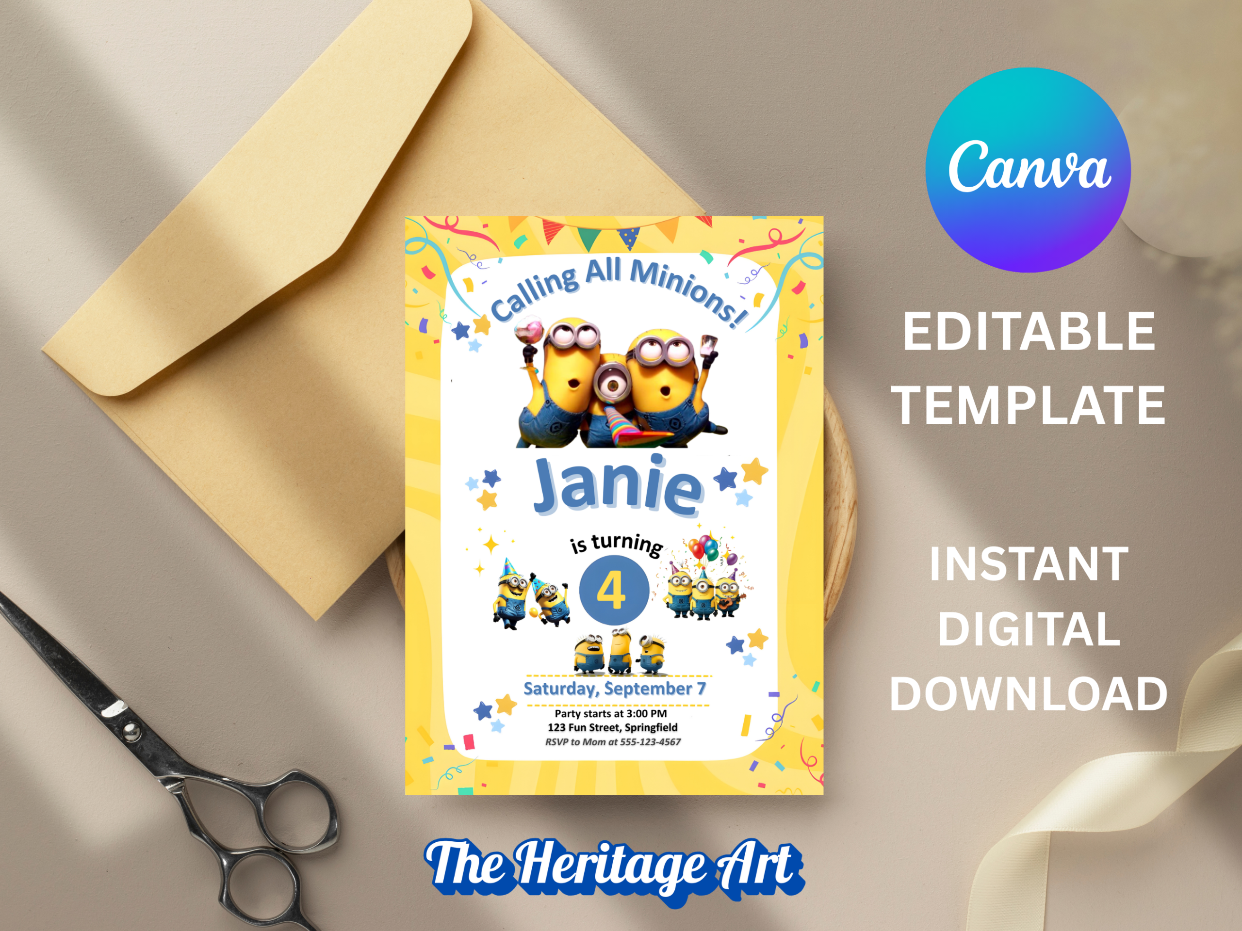 Minions Birthday Invitation Template | Editable Canva Design | Baby | 60683